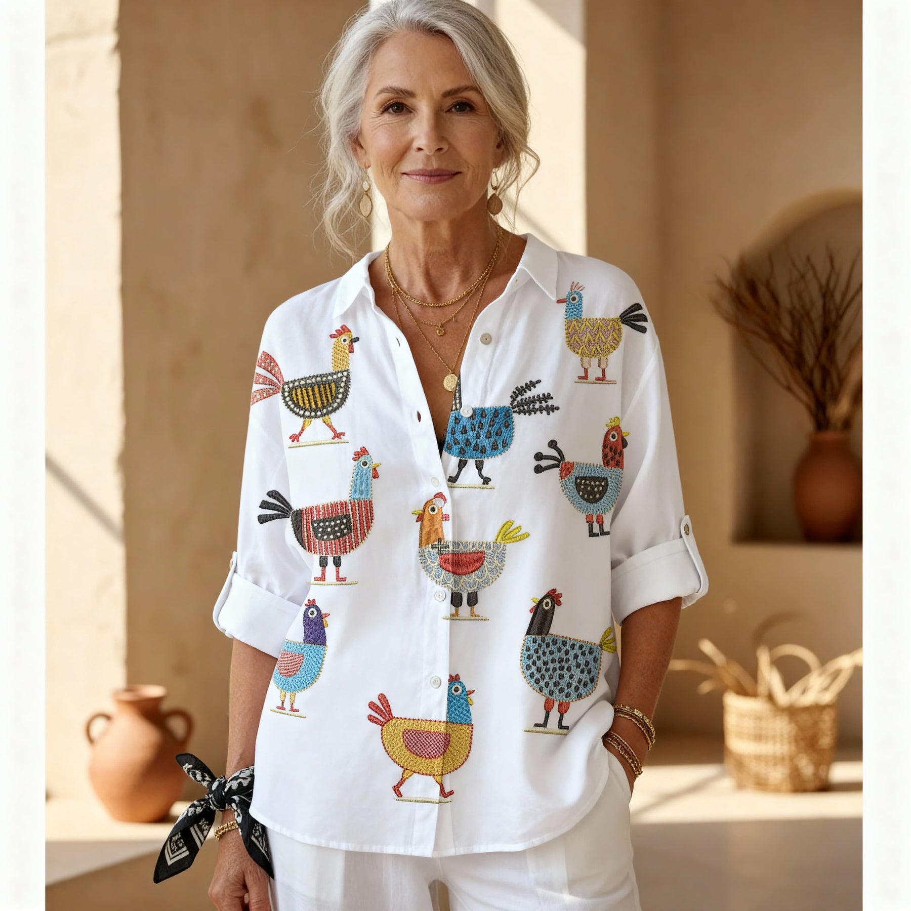 אינגריד - חולצת תרנגולת שובבה היא פריט בולט עם אופי קליל, שכוללת איורים צבעוניים ושובבים של תרנגולות שמוסיפים נופך כפרי ומהנה. הבד הלבן והפריך מדגיש את העיצובים התוססים, ומעניק מראה נינוח אך מושך תשומת לב.