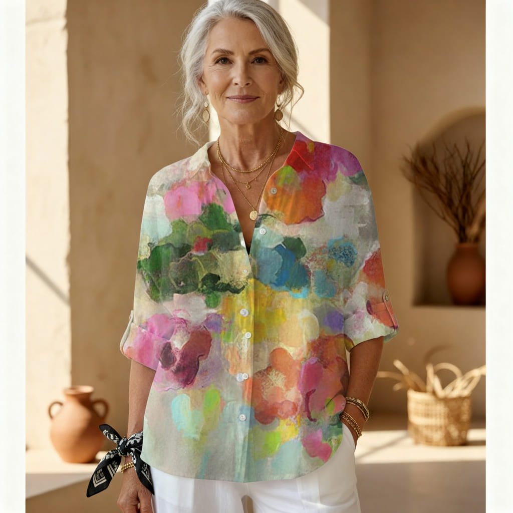 אלארה - חולצת חלומות צבעי מים הופכת מברשות רכות לאופנה. עם תערובת של ורודים, ירוקים, צהובים וכחולים עזים, חולצה זו מפיצה אלגנטיות אמנותית וקסם מעורר השראה. כל פרט מרגיש כמו יצירת מופת מצוירת, מושלמת עבור נשים שאוהבות סגנון יצירתי ובולט.