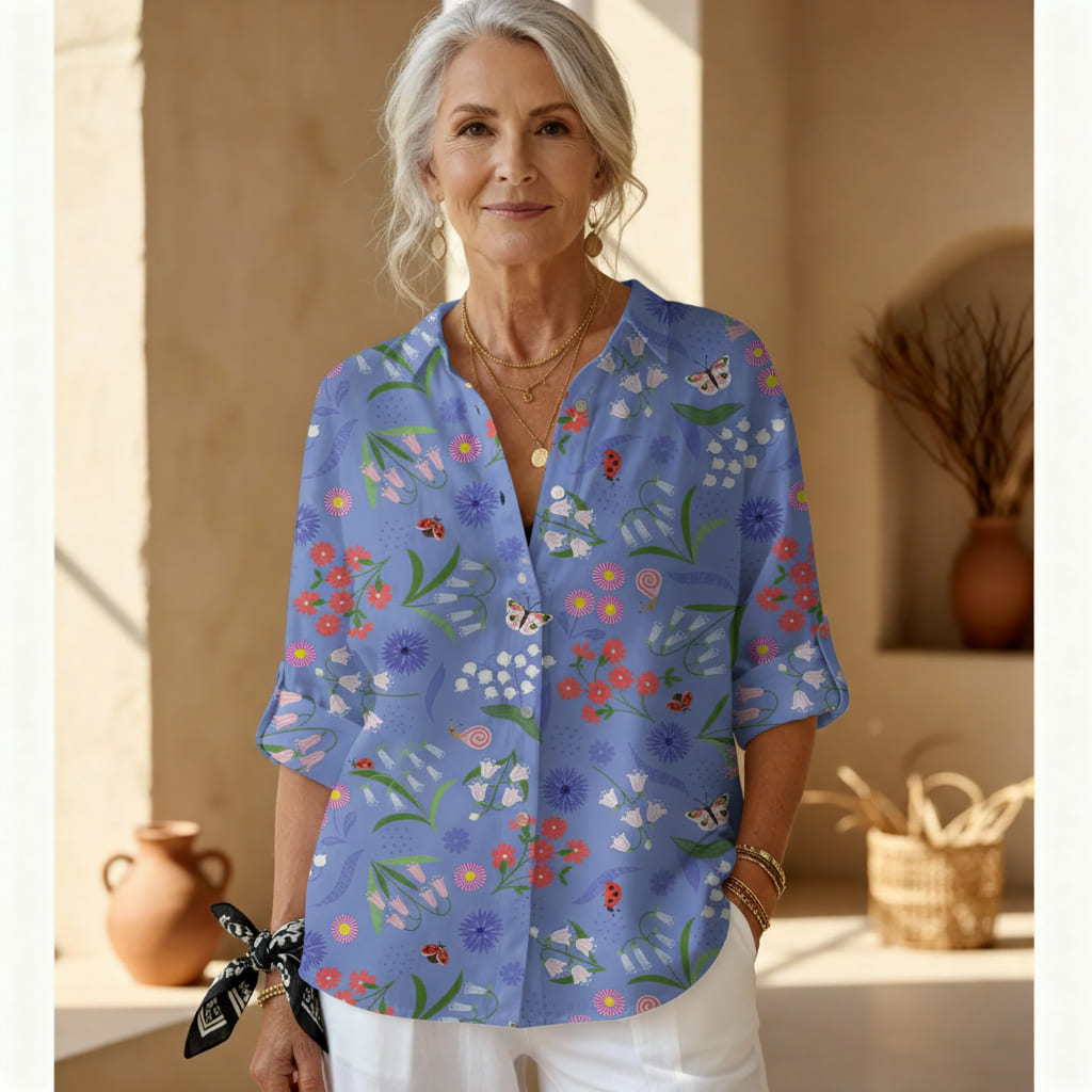 פליסיה - בלוז פריחת שדה היא פריט חיוני שמשקף את יופיו של האביב עם הדפסי פרחים עדינים, פרפרים וספורטאים על רקע כחול רך. קליל ואוורירי, זו הבלוז המושלמת לימים מזדמנים, מסיבות גן, או פשוט להוסיף נגיעה שמחה למראה היומיומי שלך.