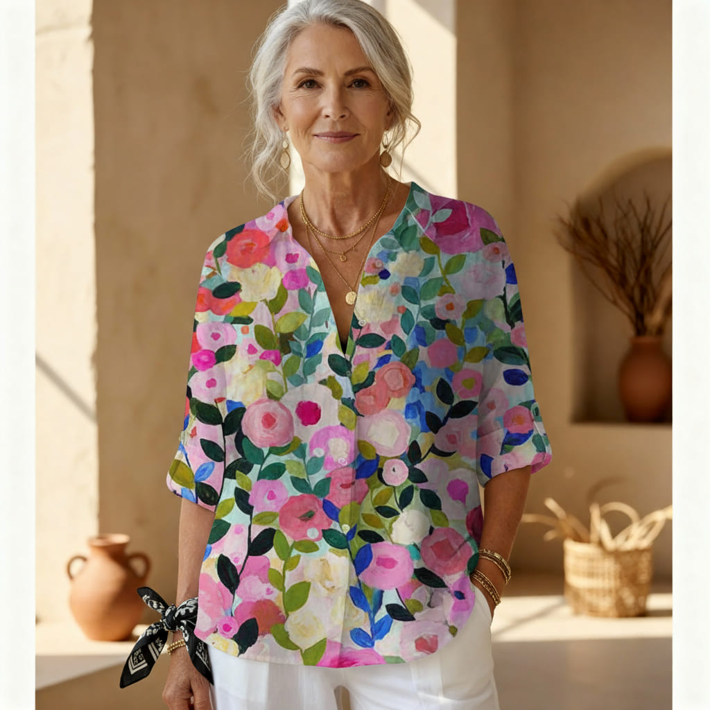 פרידה - בלוזת קנבס בלום מתפוצצת עם קסם ציורי, עם פרחים בסגנון ידני בצבעים עשירים של ורוד, ירוק, כחול וצהוב. תוססת אך אלגנטית, בלוזה זו היא פריט בולט לנשים שאוהבות פרטים אמנותיים וסגנון חסר מאמץ. מושלמת לארוחות צהריים מזדמנות, טיולים בסוף השבוע, או להוסיף נגיעה חיה למראה היומיומי שלך.