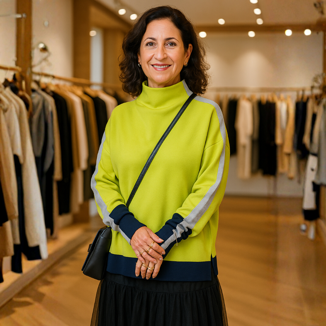 סוודר אלגנטי ומדויק לנשים שאוהבות מראה נקי, איכותי ומחמיא. קווים נקיים, תחושה רכה ונגיעה מודרנית בשרוולים יוצרים מראה נשי ובטוח שמתאים לכל שעות היום.