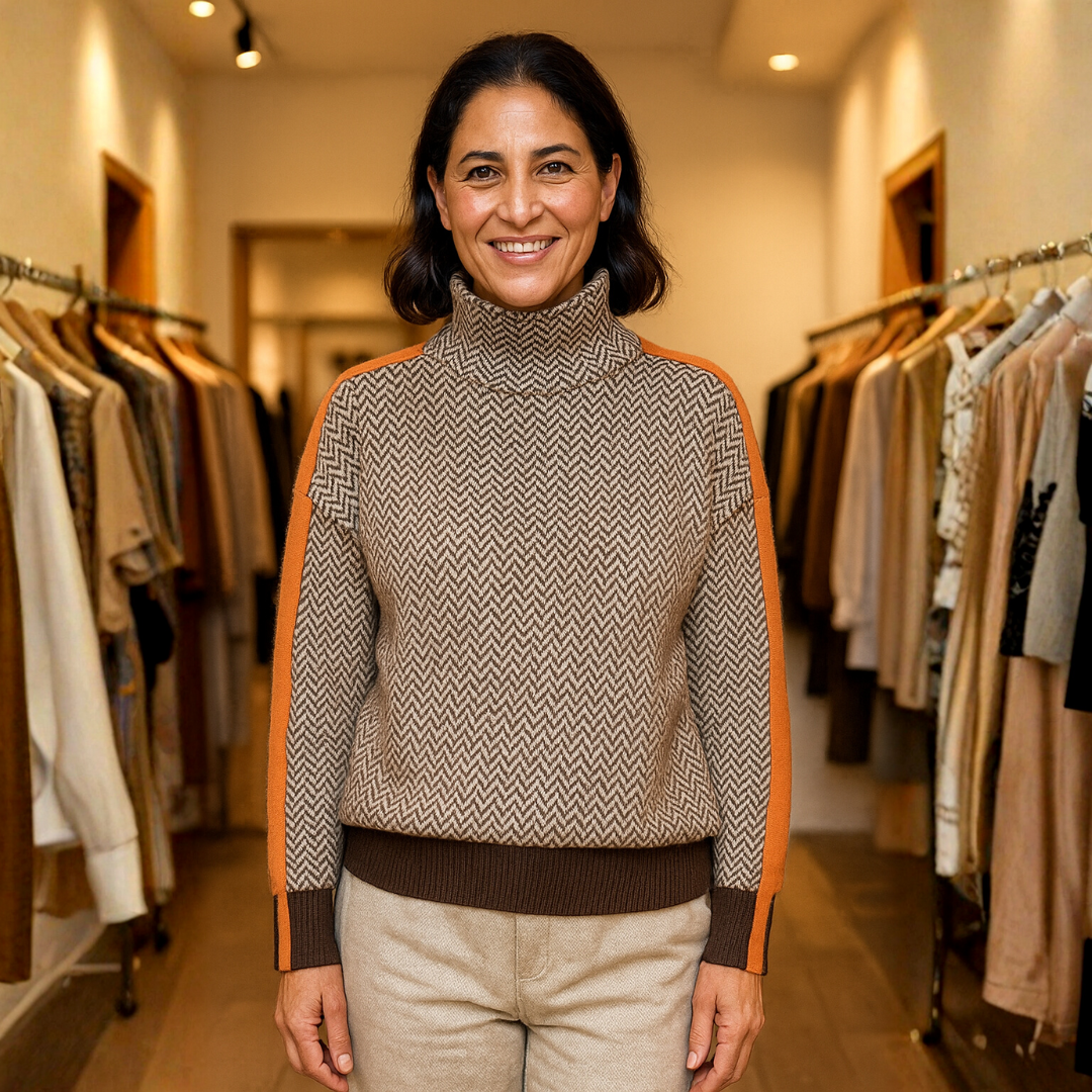סוודר מלא נוכחות, לאישה שמעריכה סטייל נקי ומדויק. צווארון גבוה, גזרה נינוחה וטוויסט מודרני בשרוולים יוצרים מראה יוקרתי ונעים שמתאים לכל יום ולכל שעה.